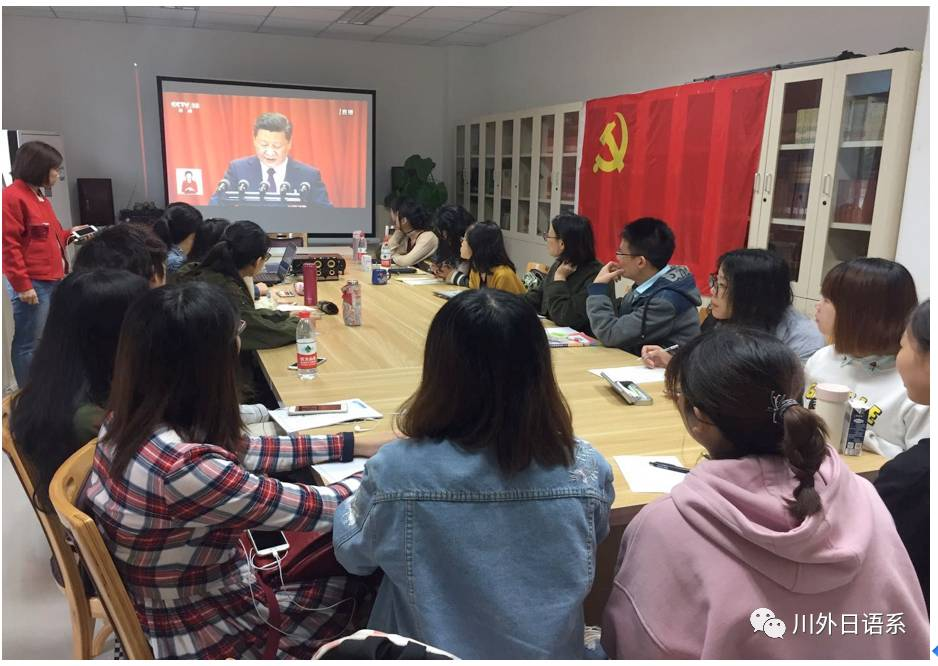 2017年10月18日上午9:00,党的第十九次全国代表大会在北京人民大礼堂举行。日语系党总支即时组织本系上班党员、干部、研究生和本科生两个党支部部分党员以及学生代表在办公楼B303会议室收看习近平总书记代表十八届中央委员会在党的第十九次全国代表大会开幕式上所作的报告《不忘初心、牢记使命,高举中国特色社会主义伟大旗帜,决胜全面建成小康社会,夺取新时代中国特色社会主义建设伟大胜利,为实现中华民族伟大复兴的中国梦不懈奋斗!》。