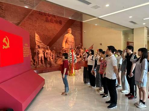 在王良同志纪念馆,本科生党支部书记金晶作为领誓人,带领全体党员,面向党旗,庄严重温入党誓词。