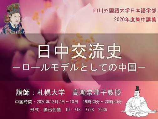 2020年12月7日至10日晚上,我校特聘教授、日本札幌大学的高濑奈津子教授亦为日语系师生开设了为期四天的线上讲座。讲座的主题是『日中交流史―ロールモデルとしての中国』。