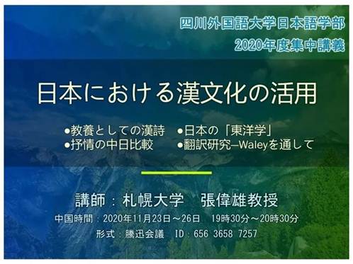 2020年11月23日至26日晚上,我校特聘教授、日本札幌大学张伟雄教授为日语系师生开设了为期四天的线上讲座,讲座的主题是『日本における漢文化の活用』。