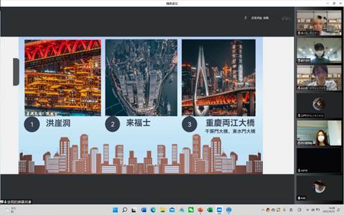第二环节主要由我校学生以ppt推介重庆巴渝文化。桂子文、罗霜、张莉、宋梓萌、玄若瑾、王小双六位同学从重庆的人文自然、景观建筑出发,以独具魅力的语言展现了重庆立体多元、鲜活灵动的特点。王小双还将川外与重庆紧密相连,介绍了川外的历史渊源、办学特色、校园特点。