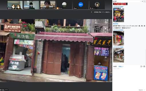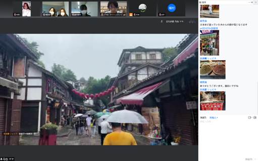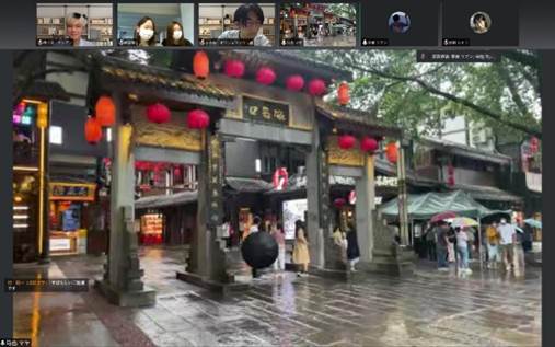 第三环节主要由我校学生组织直播队伍进行磁器口户外直播。由马也、李雯、王珊珊、刘丝丝、朱美羲五名同学组成的直播团队克服设备、天气等困难,以磁器口为巴渝文化代表,介绍了重庆美食文化、历史文化、艺术文化。期间与北陆大学西川瑠瑠伽、峰菜摘、额谷那央三位同学积极互动,气氛融洽热烈。