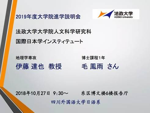 10月27日,日语系邀请法政大学大学院人文科学研究科伊藤达也教授及学生代表毛凤雨同学对法政大学大学院留学项目进行介绍,日语系师生等相关人员参加了此次宣讲。