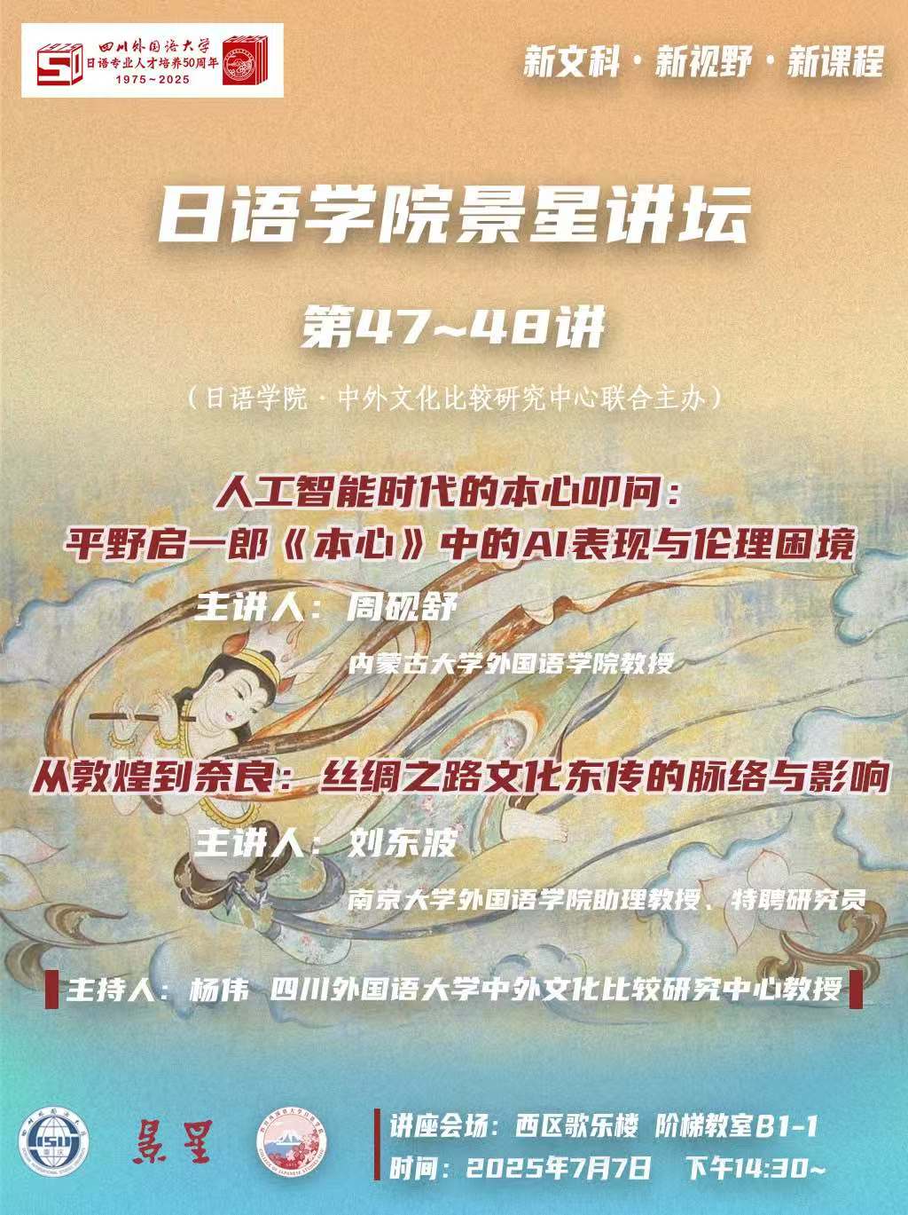 7月7日下午两点半,由日语学院与中外文化比较研究中心联合主办的“景星讲坛”第47-48讲在我校西区歌乐楼阶梯教室B1-1成功举行。本次讲坛特邀内蒙古大学外国语学院教授周砚舒、南京大学外国语学院特聘研究员刘东波担任主讲人,由中外文化比较研究中心教授杨伟担任主持人。日语专业在校本科生、研究生以及部分专业教师参加了此次学术活动。