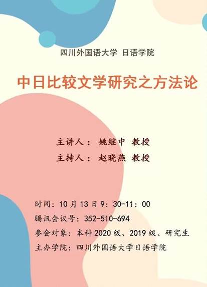 10月13日上午9:30,我院博士生导师姚继中教授为高年级本科生及全体研究生进行了题为“中日比较文学研究之方法论”的线上学术讲座。讲座由赵晓燕教授主持。