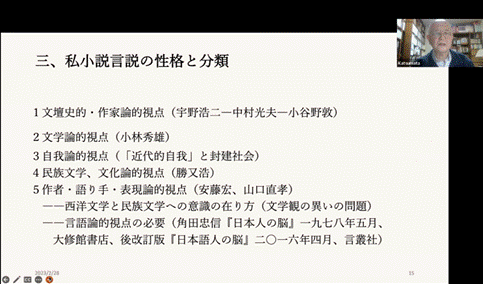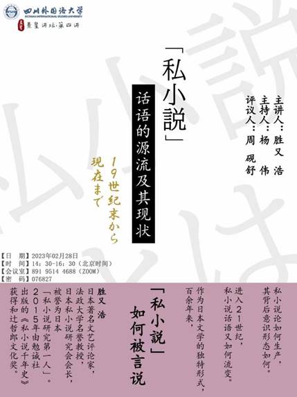 2023年2月28日14:30,“景星讲坛”第四讲在云端准时开场。本次讲坛的主讲人为日本著名文艺评论家、法政大学名誉教授、日本私小说研究会会长胜又浩教授,我校日本学研究所所长、博士生导师杨伟教授担任讲座主持人,内蒙古大学周砚舒副教授担任评议人。共有来自日、美等国以及京、沪、宁、穗等城市数十所高校的研究者及师生100余人在线参加了该讲座。