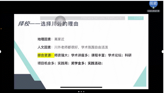 在往届优秀营员交流环节中,2019年优秀营员阳君同学结合自己的经历从师资、课程、学术活动、实践活动、奖学金政策以及如何就业等方面为营员们进行了分享。