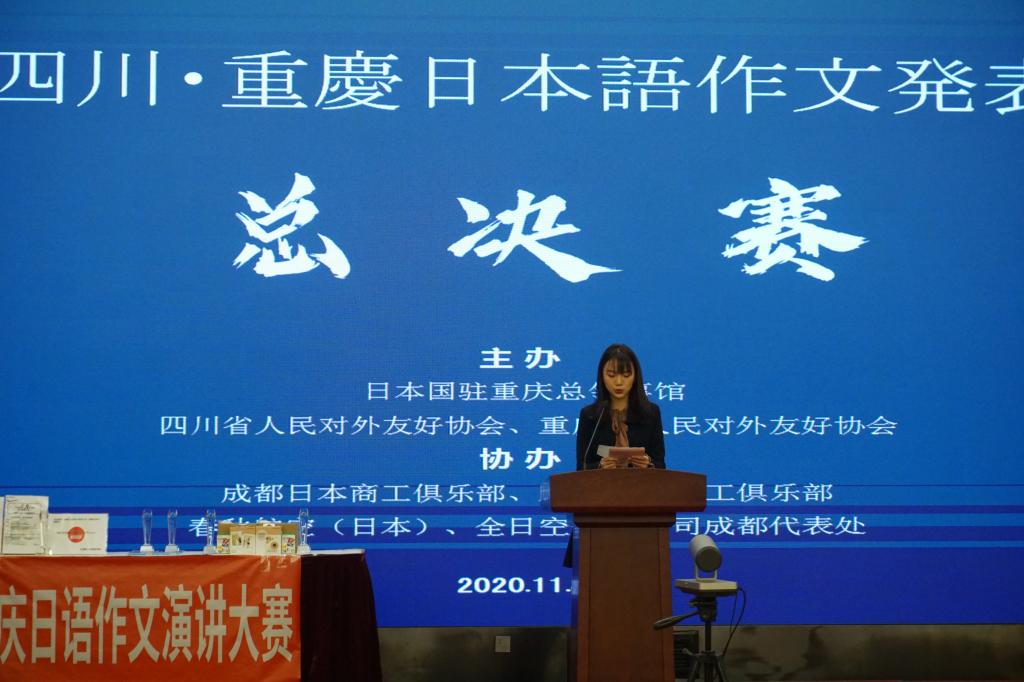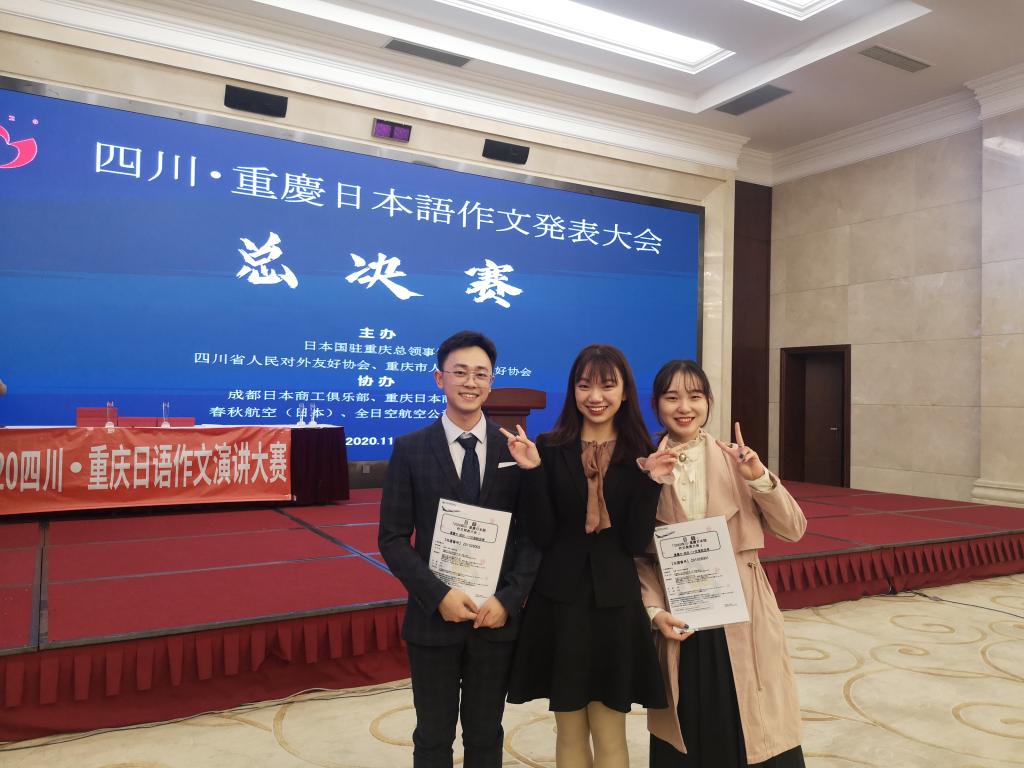 2020年11月,由日本国驻重庆总领事馆与四川省人民对外友好协会,重庆市人民对外友好协会主办,成都日本商工俱乐部,重庆日本商工俱乐部,全日空航空公司成都代表处、春秋航空(日本)协办的“2020四川・重庆日语作文演讲大赛”总决赛在重庆市人民政府外事侨务办公室会场举行。从来自19所学校的139组投稿200余名参赛学生(其中,初级组收到来自14所学校的64组投稿,高级组收到来自11所学校的75组投稿)中脱颖而出,我校4组同学入围本次大赛的决赛,初级组:19级曾艺,19级李如茵,中高级组:18级王桔,18级吴雨桐,18级刘泉,17级龙文威,17级甘李煜琳,研究生贾曜,研究生陈晓钰。