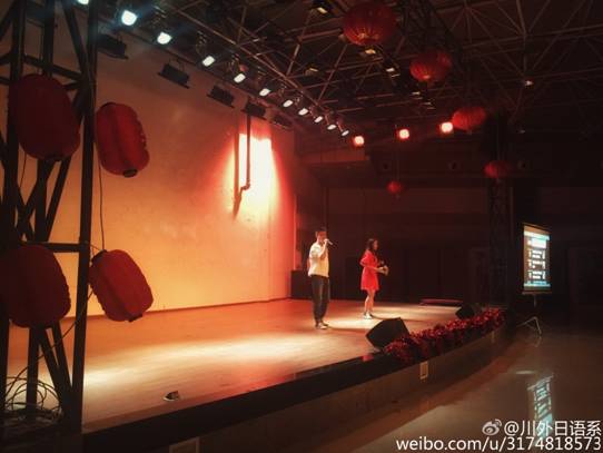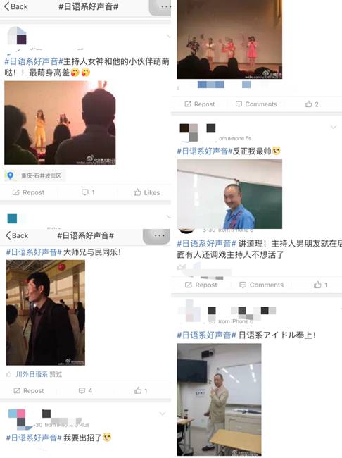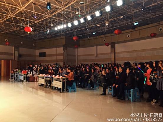 当然,时下流行的比赛现场互动方式微博墙刷屏是少不了的,同学们随手微博刷屏,发布心情词语参与#日语系好声音#话题的评价和讨论,直播整个比赛现场,说出支持的选手,还有的同学在微博墙上放出许多在场老师的日常教学、工作、生活照片,引得现场师生欢声笑语,气氛欢乐而融洽。