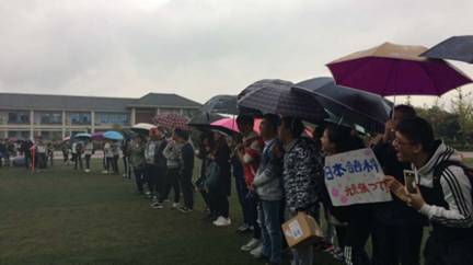 2016年10月28日下午,这一天没有秋高气爽与晴空万里,有的只是阴雨连绵与冷风刺骨。天公真的不作美。预定下午2:00正式开始的新生广播操比赛只得在菲菲阴雨中拉开帷幕,而且渐落渐大的雨滴打湿了运动场地,打滑了塑胶跑道,淋透了新生同学们单薄的衣服,但是没有浇灭全体日语系2016级新生同学的满腔热情。