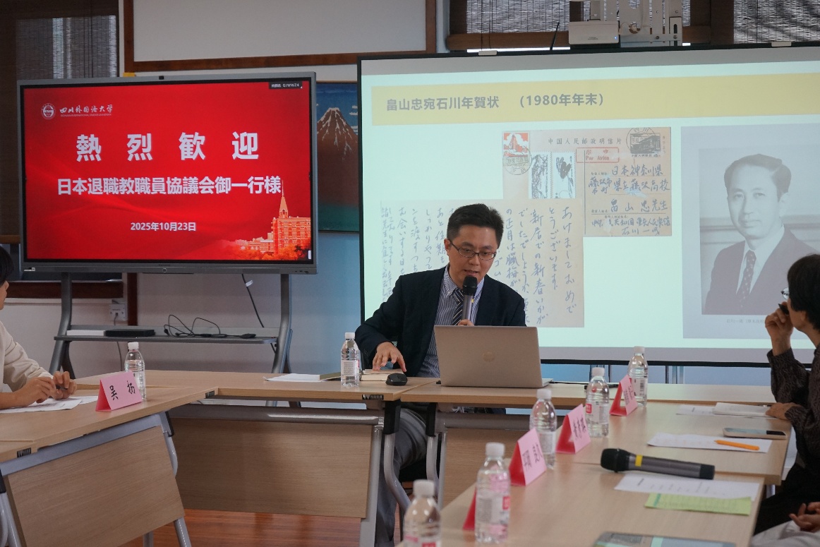 座谈伊始,日语学院副院长陈可冉教授代表学院对日本退休教职员协会的来访表示热烈欢迎,介绍川外日语专业的历史沿革与发展,创始人黄瀛教授的生平事迹以及日语学院历任日本外教,并提出对深化中日人文交流的期待与展望。