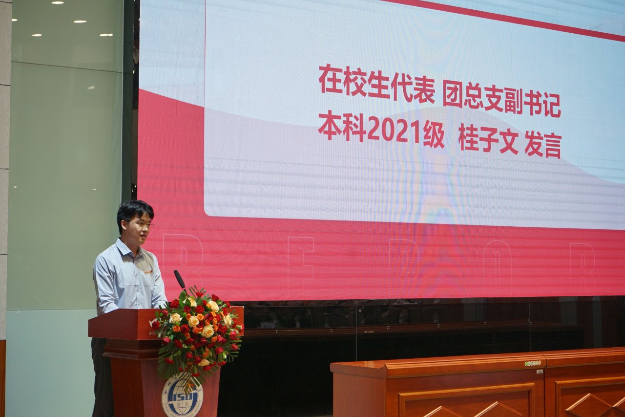 学院上一届团总支副书记 2021 级桂子文同学以过往经历寄语新生,要在学校和学院的广阔发展平台上找到自己前进的方向,做好规划,坚持学习,不断创新,参与实践,创造自我价值,实现人生价值,在奋斗中顽强拼搏。