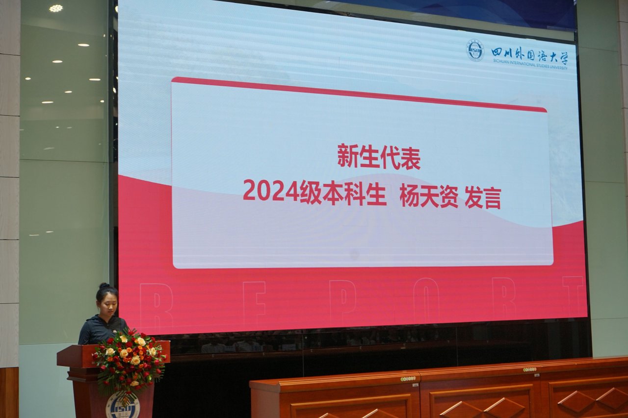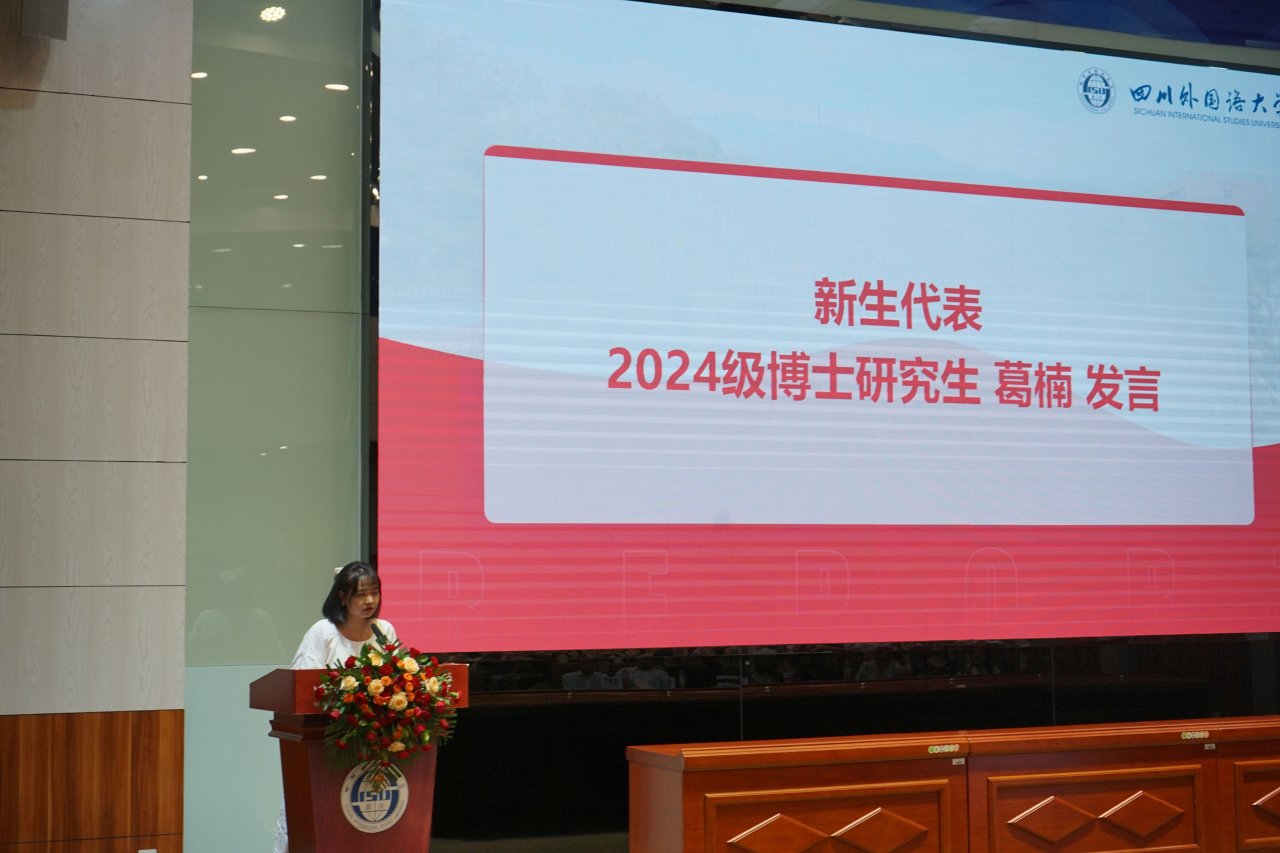 2024级博士研究生新生代表葛楠同学分享了成长之路上心态的变化寄语新生们在成长之路上需要认清自己,证明自己,接纳自己,找到适合自己的快乐动力。她表示,研究虽然是孤独的,但研究者不孤独,大家应该在细微之处做研究,从小切口出发,通往知识的大门,开川外门,见山外山。