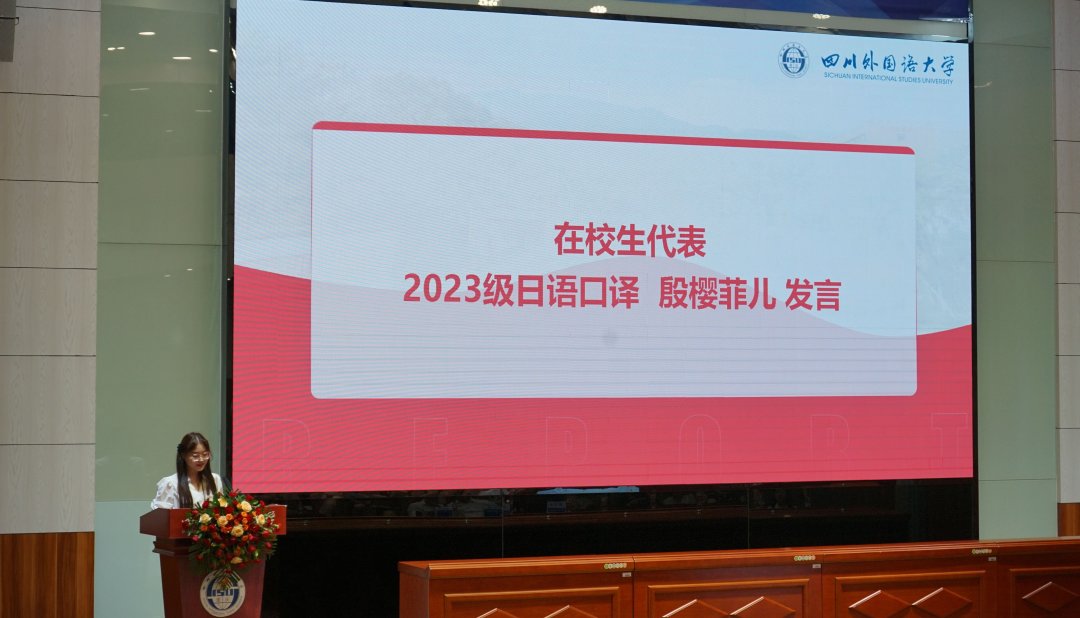 2023级日语口译殷樱菲儿同学通过分享自己成长经历寄语本科生要学会独立自主,自我管理,自我决策,勇于尝试。告诫研究生心态决定状态,不论是学硕专硕,都要戒骄戒躁,才能行稳致远,踔厉奋发,砥砺前行。