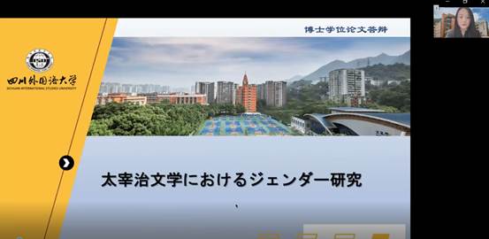 答辩会上,博士生导师杨伟教授对答辩人陈潇潇同学的培养情况和在读期间取得的相关成果进行了介绍:陈潇潇同学在博士就读期间(2017年9月-2023年6月)科研成果显著,共发表论文6篇,其中在《日语学习与研究》及《外国语文》上各发表1篇,主持重庆市研究生创新重点项目1项,另参加多项学术交流活动,具有较扎实的学术研究能力。之后,陈潇潇同学就学位论文《太宰治文学中的社会性别研究》进行了个人陈述,汇报了其论文的研究意义和目的、研究方法、研究框架、核心观点、主要结论等。评委老师针对论文内容对答辩人汇报进行了全面、深入的点评,并就关心的问题进行了质询。陈潇潇同学对答辩委员会专家提出的问题进行了认真、全面的回答,表示将充分吸收各位专家提出的宝贵意见和建议,进一步深入修改和完善毕业论文,并贯彻到今后的研究中去。