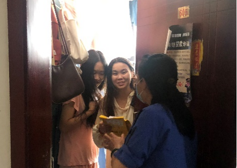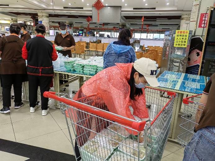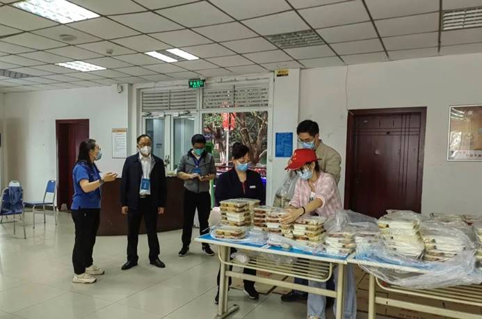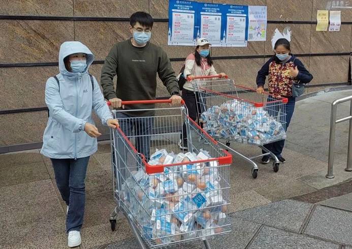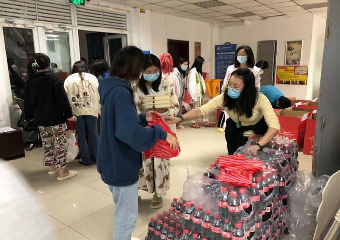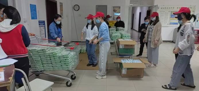 疫情来势汹汹,一波三折。从10月13日学校再次突发一例阳性病例开始,曾书记就住到了办公室里(身赴抗疫一线),参与繁琐而沉重的抗疫防疫工作。但曾书记不曾抱怨,“我就把每一次送餐当作锻炼了。”在疫情防控工作初始,曾书记和她带领的学工团队也还找不到方向,但在摸索之中越发具备经验,一些事情处理起来可以说是得心应手。“记得10月8日那天下着小雨,我们穿着雨衣去食堂领餐再分发到学生手上,因为经验不足、人手不够、天气恶劣等原因导致我们效率不高,甚至有同学直到下午两点多才吃到午饭。后来慢慢地有了经验,在楼栋招募了志愿者同学,送餐、组织核酸等工作效率越来越高了,乃至于后来我一个人组织志愿者们一起送餐的时候也能做到二十多分钟完成送餐任务,让大家按时吃到热腾腾的饭菜。”(日语学院负责松苑10舍和松苑11舍,共930余人。)