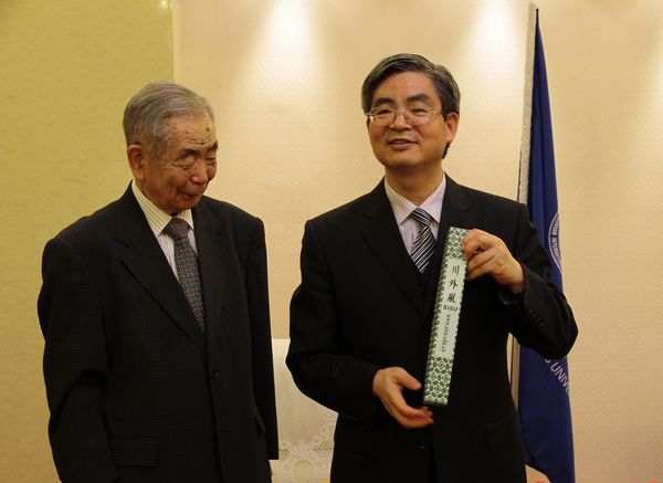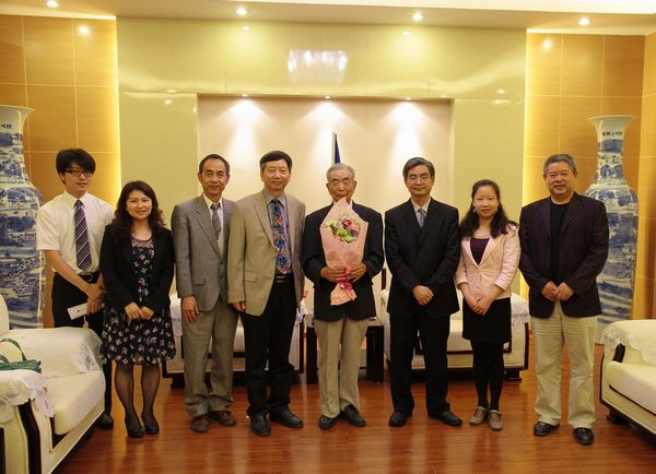 仪式结束后,李校长、乐副校长等与会老师、学生代表和福田老师合影留念。晚上,乐勇副校长宴请了福田繁先生。