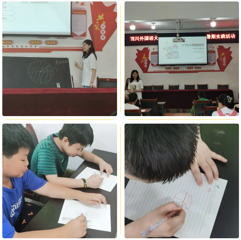 7月21日志愿者们开展了心理健康教育宣讲活动,此次心理健康课堂分为两个环节,引导青少年们学习“情绪蛋糕划分”和进行心理小游戏。大家通过切蛋糕的形式对自己的心理情绪进行划分,并用不同颜色表示出来。这样青少年们就明确知道自己的情绪占比并管理自己的情绪,从而进行自我调节。同时,志愿者们还通过视频播放告诉青少年们如何正确调整自我情绪、如何避免情绪等问题。接着进行了有趣的心理小游戏,规则如下:一张纸代表一个人,对一个人伤害一次,我们就将纸折一次,反复进行,最后将这张纸展开,会发现纸已经布满折痕,也就代表这个人伤痕累累。通过这个游戏让青少年们明白伤害一个人的可怕之处,引导青少年们在保持自己心理健康的同时也需多多关心他人。希望参与的青少年们通过这次的心理健康课堂,能够像建筑房子一样筑牢自己的心防,保持良好的心理健康状态。