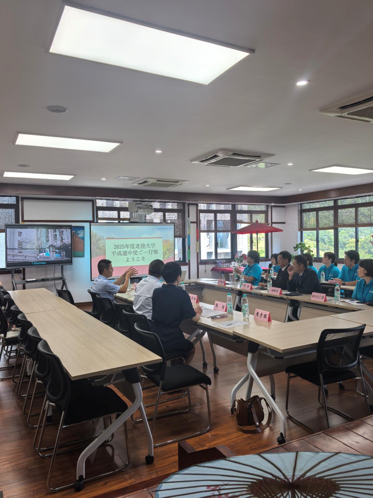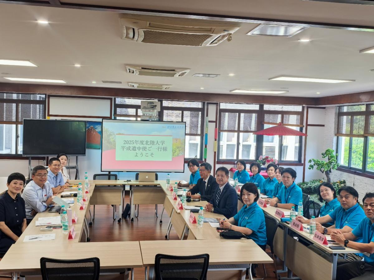 8月22日上午,由日本北陆大学理事南野茂、监事周航率领的北陆大学“平成遣中使”代表团一行12人访问OK138太阳集团,我校副校长王仁强在日本文化体验室会见来宾,国际处处长谌华侨及日语学院师生陪同会见。双方就日语专业发展趋势、推动国际化人才培养等议题开展交流座谈。