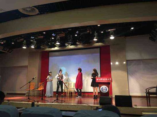 高年级同学令我们仰慕。大三1、2班同学合作表演的正能量故事—《女演员》,给大家讲述了一个充满着对理想的希望。此剧开始场景设置为电视剧拍摄现场,演员们说着自然流利的日语。每个人都有属于自己的梦想,将其深深铭记在心并且值得付出一切努力去为它奋斗才是最重要的!是啊,除了演员们深情的表演,我想这也是这部话剧最想传递给我们的情怀和力量吧。