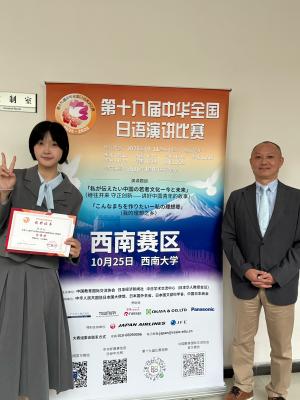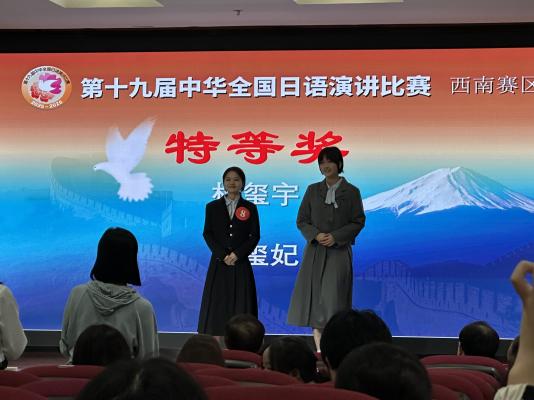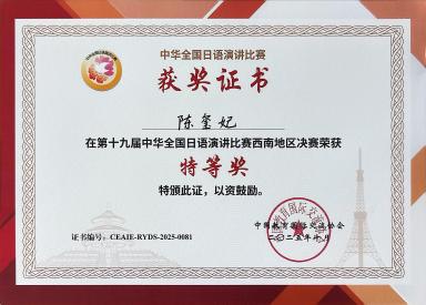 2025年10月25日,第十九届中华全国日语演讲比赛西南赛区在西南大学举行。我校2023级陈玺妃同学与西南地区30名选手同台竞技,最终以总排名第二的优异成绩斩获特等奖,并获得赴东京参加总决赛的资格。村瀬隆之老师获评“优秀指导教师”。