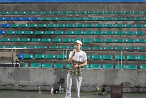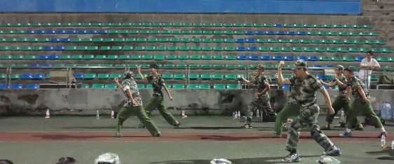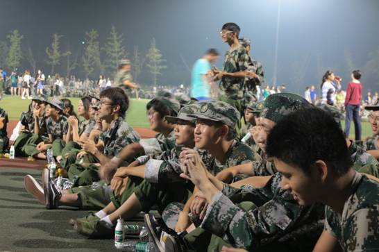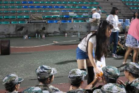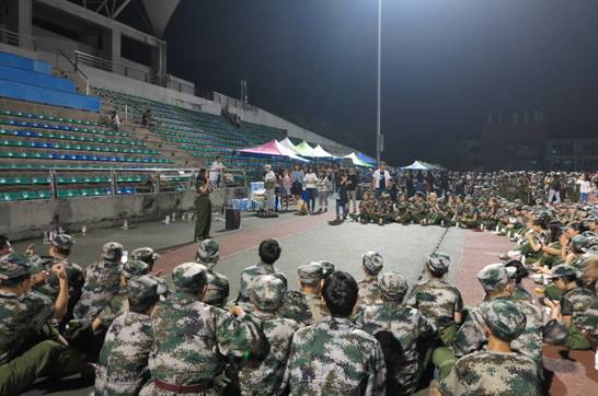 刚刚结束了一天训练的小鲜肉们,虽然有些疲惫,但仍对老师、学哥学姐的到来表示了非常热烈的欢迎。在激烈的掌声中,大家席地而坐,围成半圆,空出一个小小的舞台。皓月当空的夜晚,运动场也是一片明亮。在主持人2014级陈柏屹学长简洁的开场白过后,由2016级辅导员金晶老师带领学哥学姐们给小鲜肉们分发慰问小零食。面对金老师及学哥学姐们暖心的微笑和递过来的小零食,小鲜肉们回应的都是甜甜的感谢和真挚的笑容,表演还未正式开始,大家初次相识的小小羞涩已经渐渐褪去。