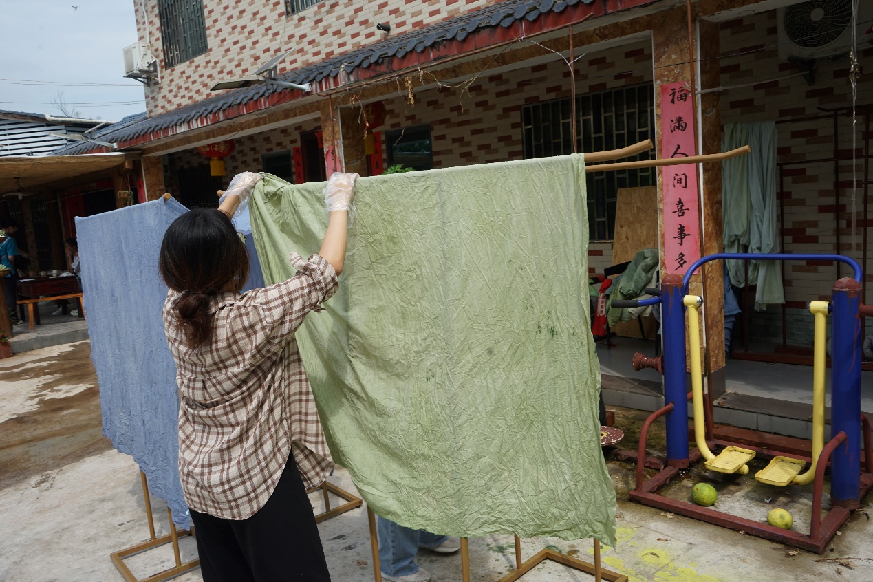 耗时一个上午,大家染出了五块不同颜色与浓度的布,看着阳光下随风摆动的植染布,大家都为自己的成果感到自豪。