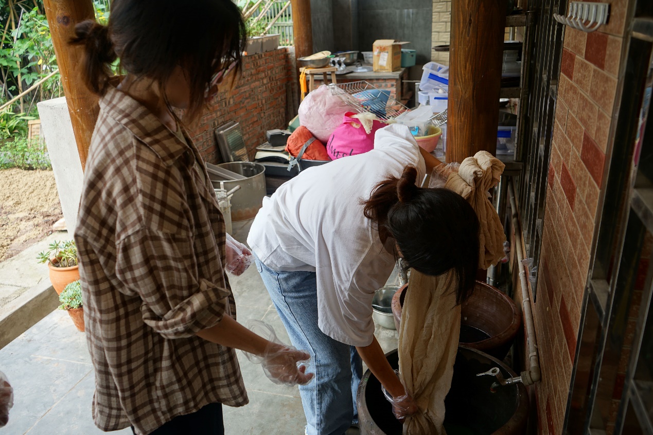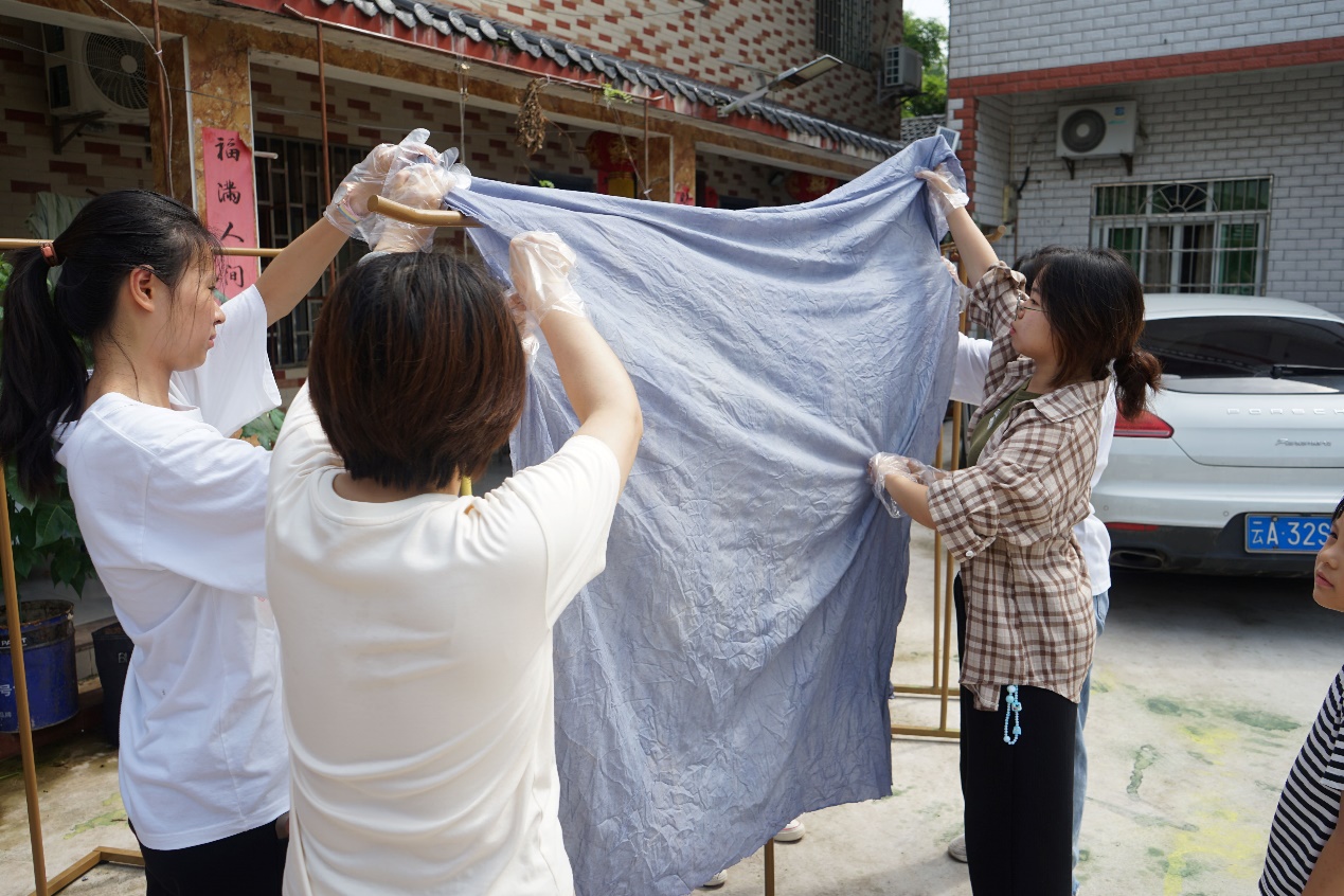 同学们跃跃欲试,跟着老师的步骤学着去染布。老师告诉我们,浸泡过程中不同的操作细节会染出不同的样式,每一块植染的布都是不可复制的。