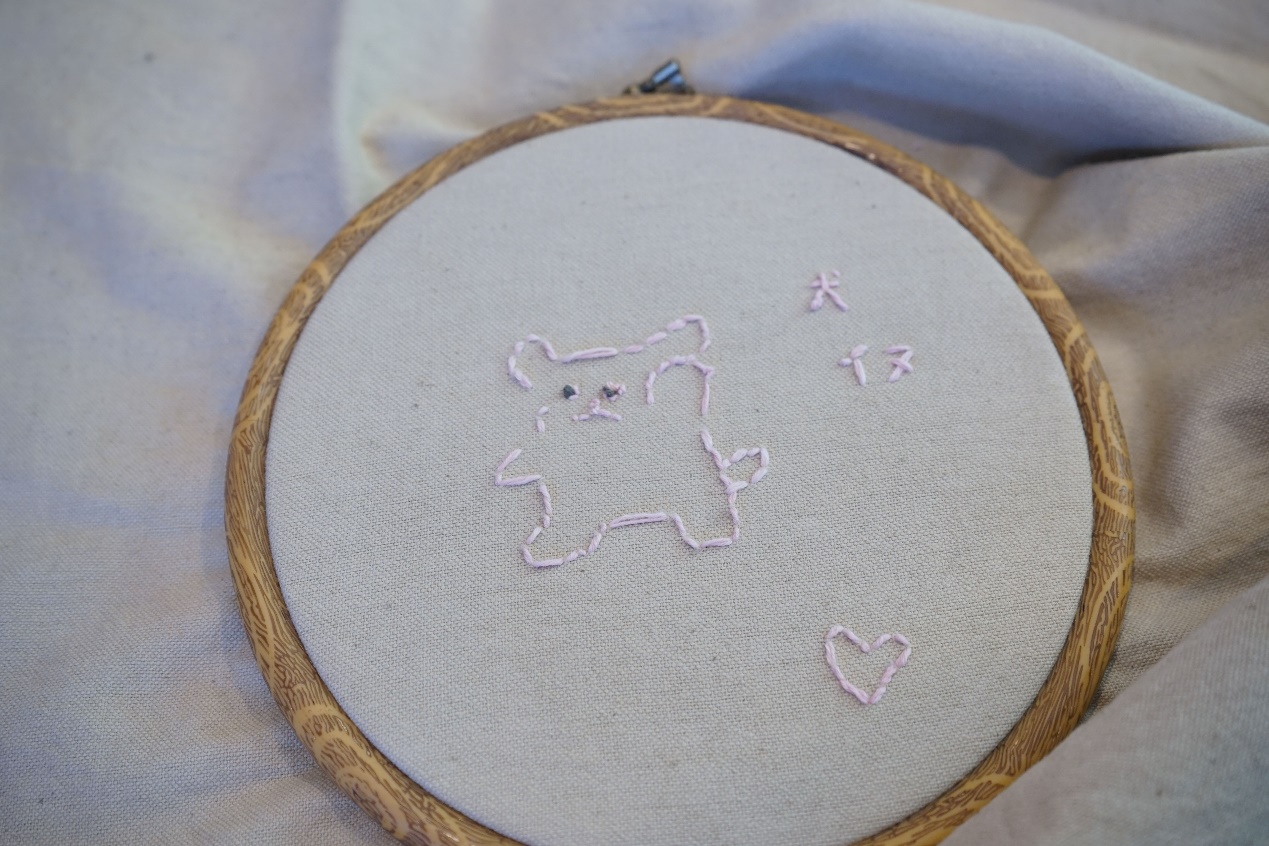 最后大家都绣出了自己满意的作品成品,线条小狗,蝴蝶,花朵等形态各异。刘萍老师一一点评了大家的作品,也对作为初学者的大家敢于尝试的精神表示赞扬。