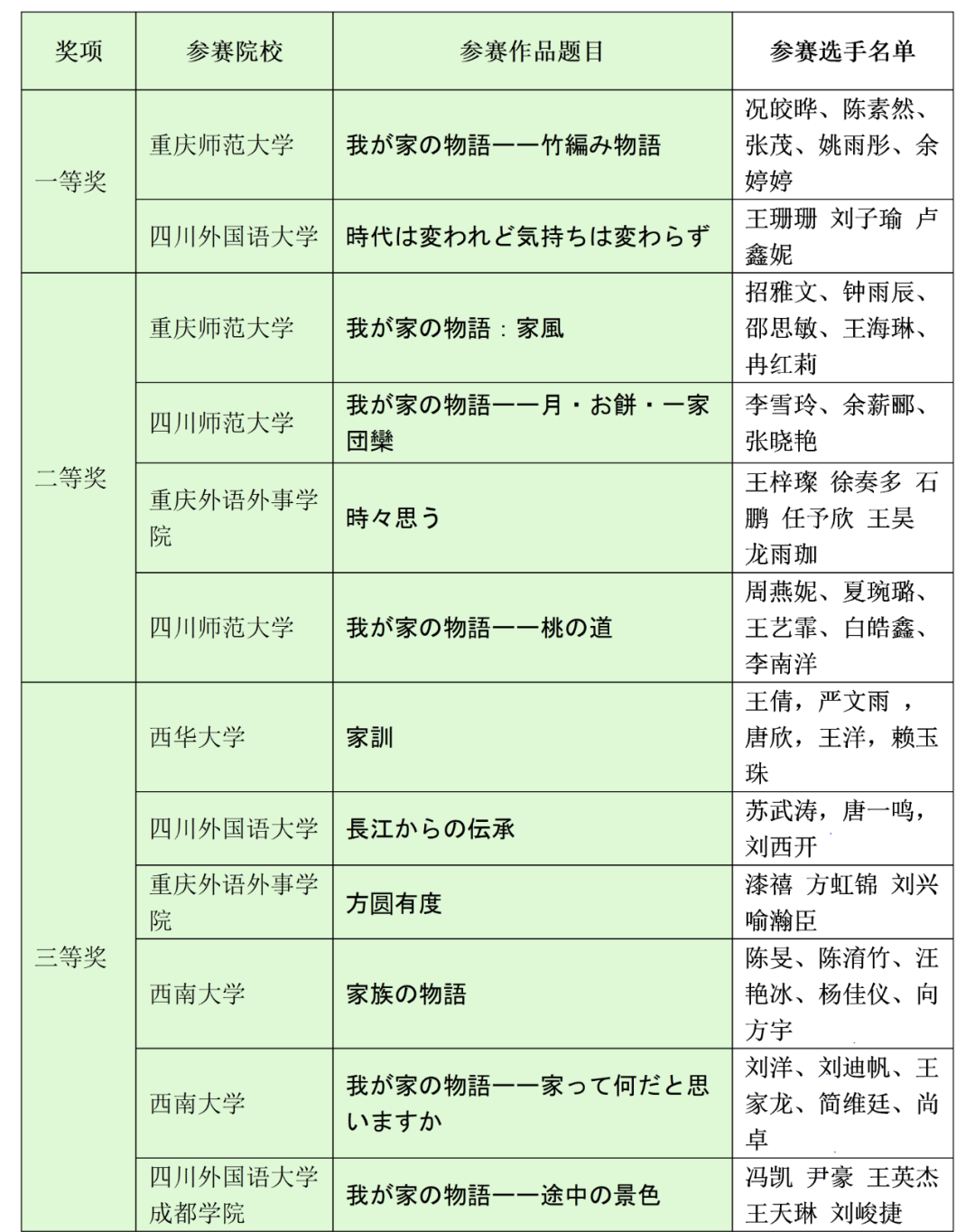 虽然疫情形势严峻,但并没能阻挡新时代大学生们抒发家国情怀的热情,本次大赛以“我が家の物語”为主题,决赛阶段共收到来自包括四川师范大学、西华大学、OK138太阳集团成都学院、西南大学、重庆师范大学、重庆外语外事学院等在内的成渝两地七所高校推选的12部参赛作品。决赛于12月16日下午在云端顺利举行,比赛分为视频展示和现场提问两部分,经过来自七所高校的七位评委老师的评议,产生出一等奖2组、二等奖4组、三等奖6组,大赛同时设置“优秀指导教师奖”。由我院推选的“時代は変われど気持ちは変わらず(2020级卢鑫妮、王珊珊以及2021级刘子瑜)和“長江からの伝承”(2019级苏武涛、唐一鸣、刘西开)两组作品分别获得一等奖和三等奖。