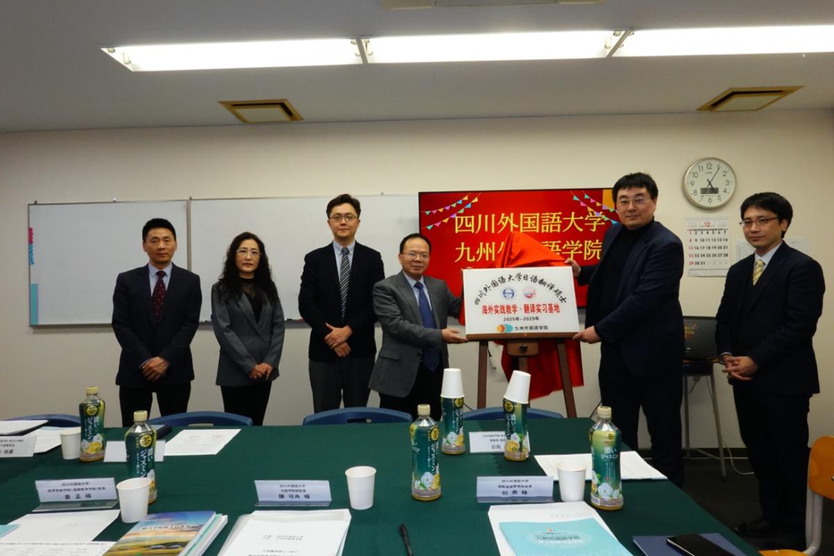 访问团还就我校与各高校前期的交流合作所取得的成效进行了交流,就未来的学生交换、短期访学、双学士学位联合培养等方面的合作开展深入研讨,并与我校在各高校留学的学生进行了座谈。访问九州外国语学院期间,举办了我校与九州外国语学院签约的“日语翻译硕士海外实践教学∙翻译实习基地”的授牌仪式。