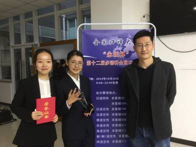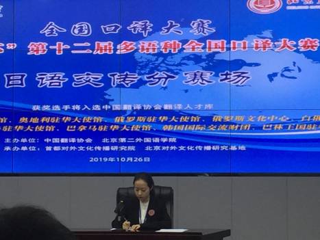 2019年10月26日,由中国翻译协会和北京第二外国语学院主办,首都对外文化传播研究院和北京对外文化传播研究基地承办的“永旺杯”第十二届多语种全国口译大赛在北京举行。我校MTI日语口译专业2018级研究生粘亚晴获得日语同传组二等奖,杨珮瑶获得日语交传组优秀奖。比赛指导教师为王宗瑜老师。