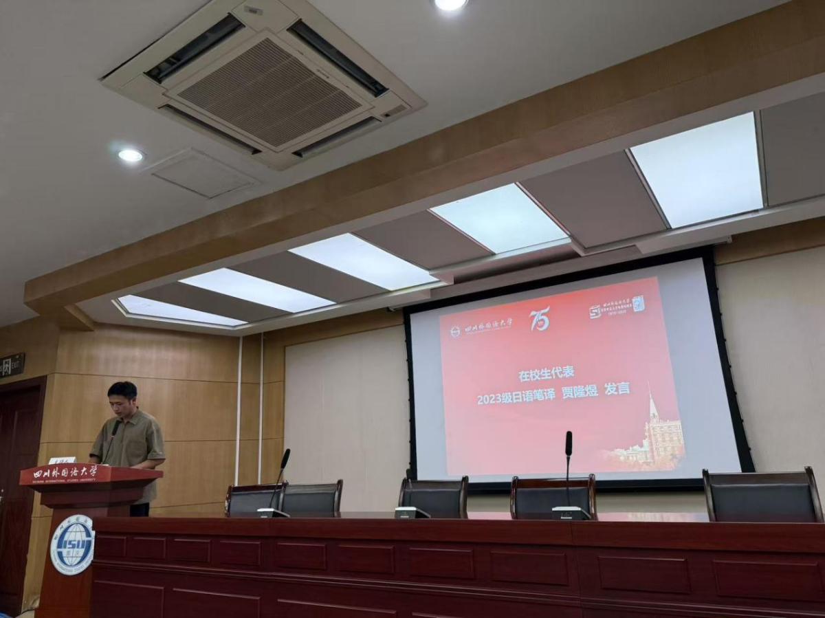 在校生代表、2023级日语笔译专业贾隆煜同学向同学们分享了自己的学习经验,建议新生合理安排时间、提升学习科研效率、积极投身实践、系统规划学术生涯。