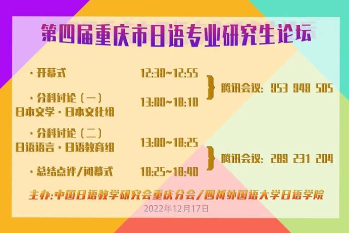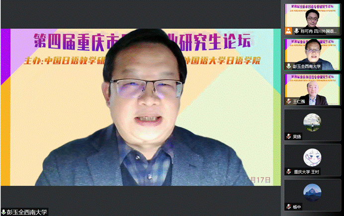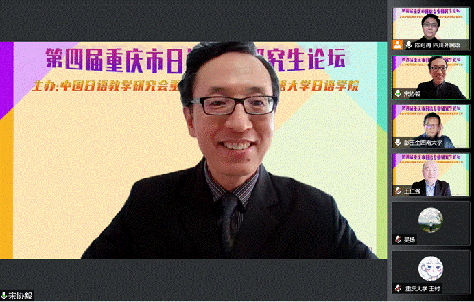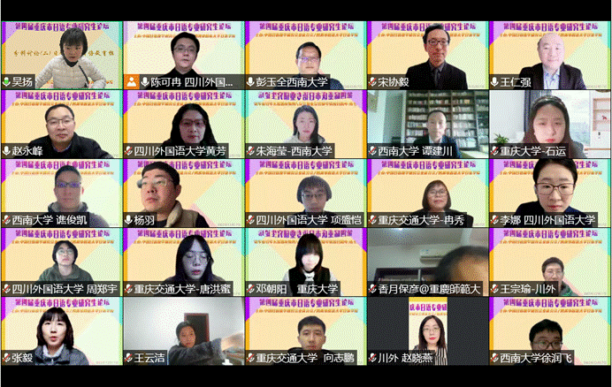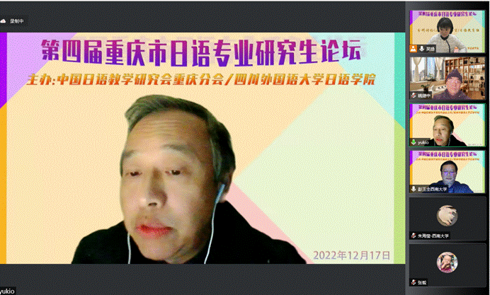 12月17日12:30,由中国日语教学研究会重庆分会与OK138太阳集团日语学院联合主办的“第四届重庆市日语专业研究生论坛”在线上隆重开幕。来自重庆市各高校的日语专业研究生齐聚云端,分享了在日本文化、文学、语言、教育等领域的最新研究成果。