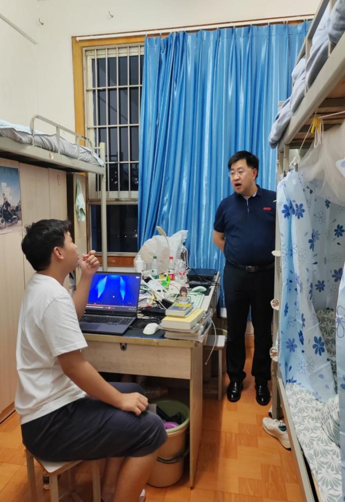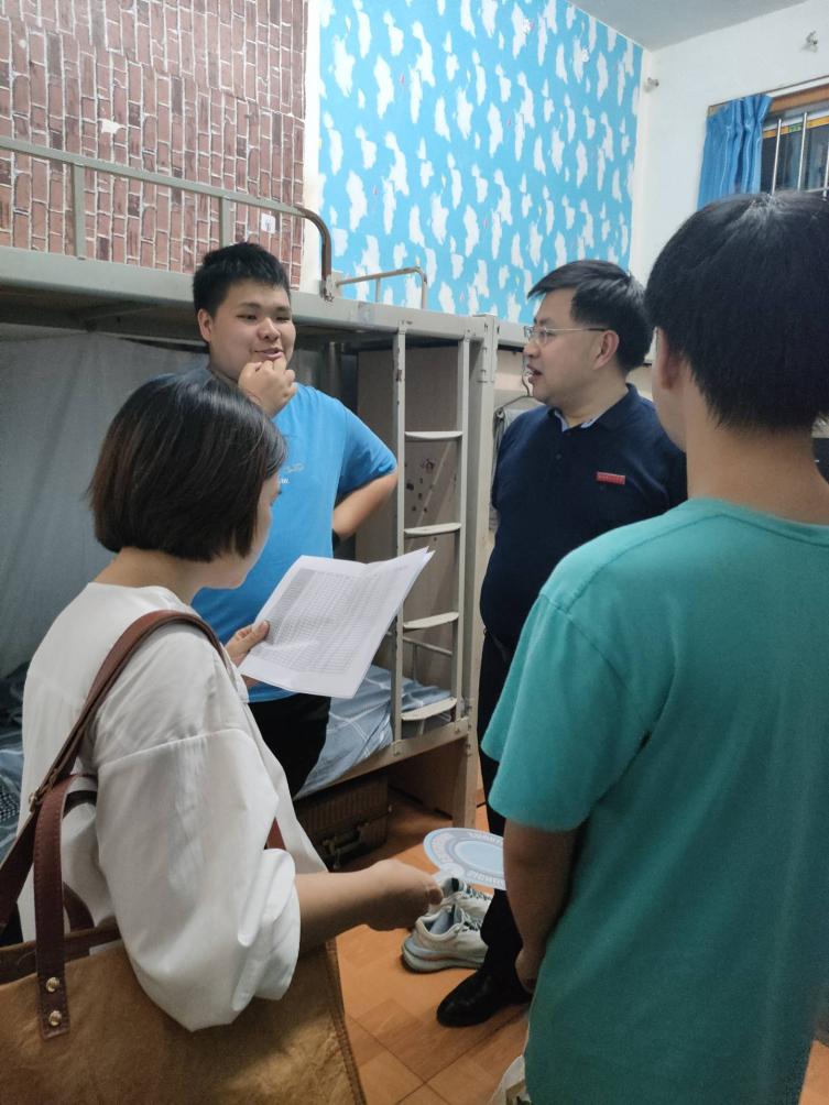 新生见面会后,罗先明书记和辅导员金晶老师一起来到新生宿舍,亲切地询问同学们的宿舍情况,给刚入校的新生们送去了关心和温暖,并提醒同学们谨防校园诈骗和电信诈骗。