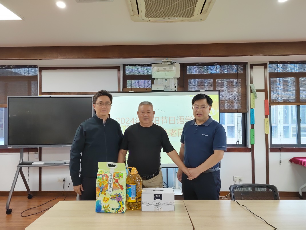 重阳敬桑榆,佳节叙深情。在中华民族传统节日重阳佳节来临之际,日语学院以登门拜访、邀请老同志回学院,打电话、发短信、发放慰问品、慰问金等形式向20余位老同志送上节日祝福。2024年10月9日下午,学院党总支书记罗先明、副院长陈可冉和组织员余岚首先在立德楼C417会议室与日语学院原党总支书记吴兴华亲切交谈。院领导表示不会忘记每一位为学院发展做出贡献的老同志,希望吴书记和离退休老同志继续关心支持学院教育教学和人才培养工作,代表全院师生祝福老同志节日快乐,身体安康。